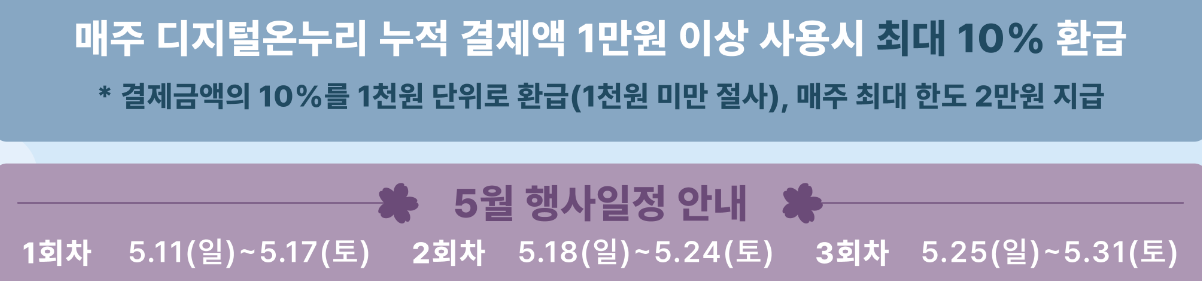 회차별로 누적된 결제금액의 최대 10%, 최대 2만 원까지 환급받을 수 있으며, 환급은 같은 디지털 온누리상품권으로 지급됩니다. 예를 들어 한 회차 동안 10만 원을 디지털 온누리상품권으로 결제한 경우, 최대치인 1만 원 상당의 온누리상품권이 환급됩니다.