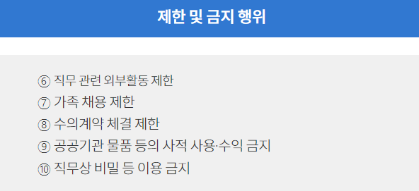 한편, 제한 행위는 공직자가 직무상 비밀이나 정보를 이용하여 사적 이익을 추구하는 것을 금지하며, 가족을 자신이 관리하는 기관에 채용하거나 계약을 체결하는 것도 제한됩니다.