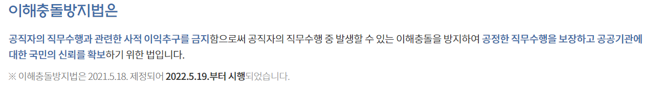 이해충돌방지법은 이런 문제를 예방하고 사전에 차단하기 위해 만들어진 법입니다.
