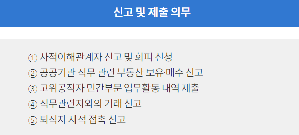 신고 대상에는 ‘사적 이해관계자 신고’, ‘직무관련 외부활동 신고’, ‘재산상 이익 신고’, ‘가족 채용 신고’ 등이 포함됩니다. 기관의 장은 해당 신고를 바탕으로 해당 공직자에게 업무 회피, 전보, 직무 변경 등의 조치를 내릴 수 있습니다.